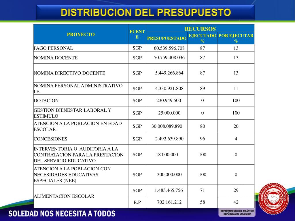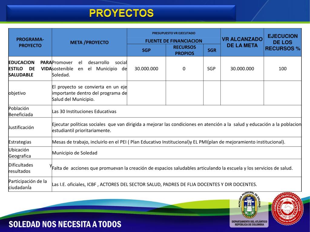 RENDICION PUBLICA DE CUENTAS PLAN DE DESARROLLO DE SOLEDAD “SOLEDAD NOS NECESITA A TODOS” EJE ESTRATEGICO: “SOLEDAD JUSTA Y EQUITATIVA” SECTOR: EDUCACION.