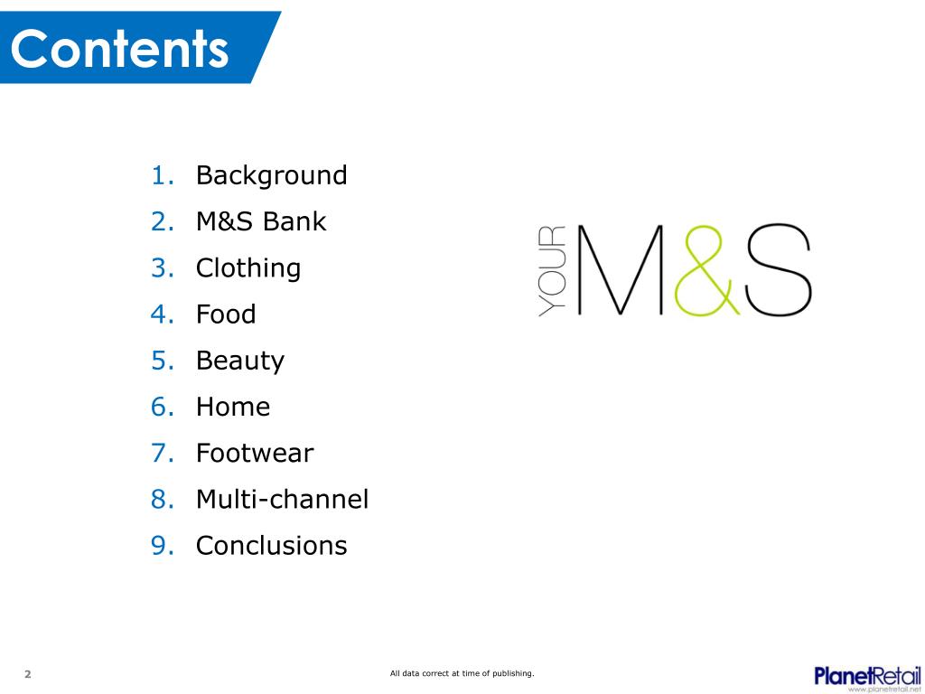 Contents Background M&S Bank Clothing Food Beauty Home Footwear Multi-channel Conclusions All data correct at time of publishing.