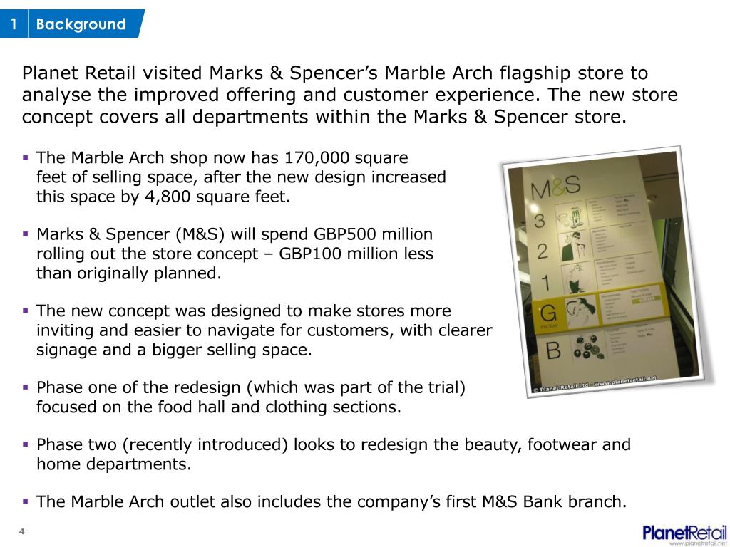 1 Background Planet Retail visited Marks & Spencer’s Marble Arch flagship store to analyse the improved offering and customer experience. The new store concept covers all departments within the Marks & Spencer store. • The Marble Arch shop now has 170,000 square feet of selling space, after the new design increased this space by 4,800 square feet. • Marks & Spencer (M&S) will spend GBP500 million rolling out the store concept – GBP100 million less than originally planned. • The new concept was designed to make stores more inviting and easier to navigate for customers, with clearer signage and a bigger selling space. • Phase one of the redesign (which was part of the trial) focused on the food hall and clothing sections. • Phase two (recently introduced) looks to redesign the beauty, footwear and home departments. • The Marble Arch outlet also includes the company’s first M&S Bank branch.