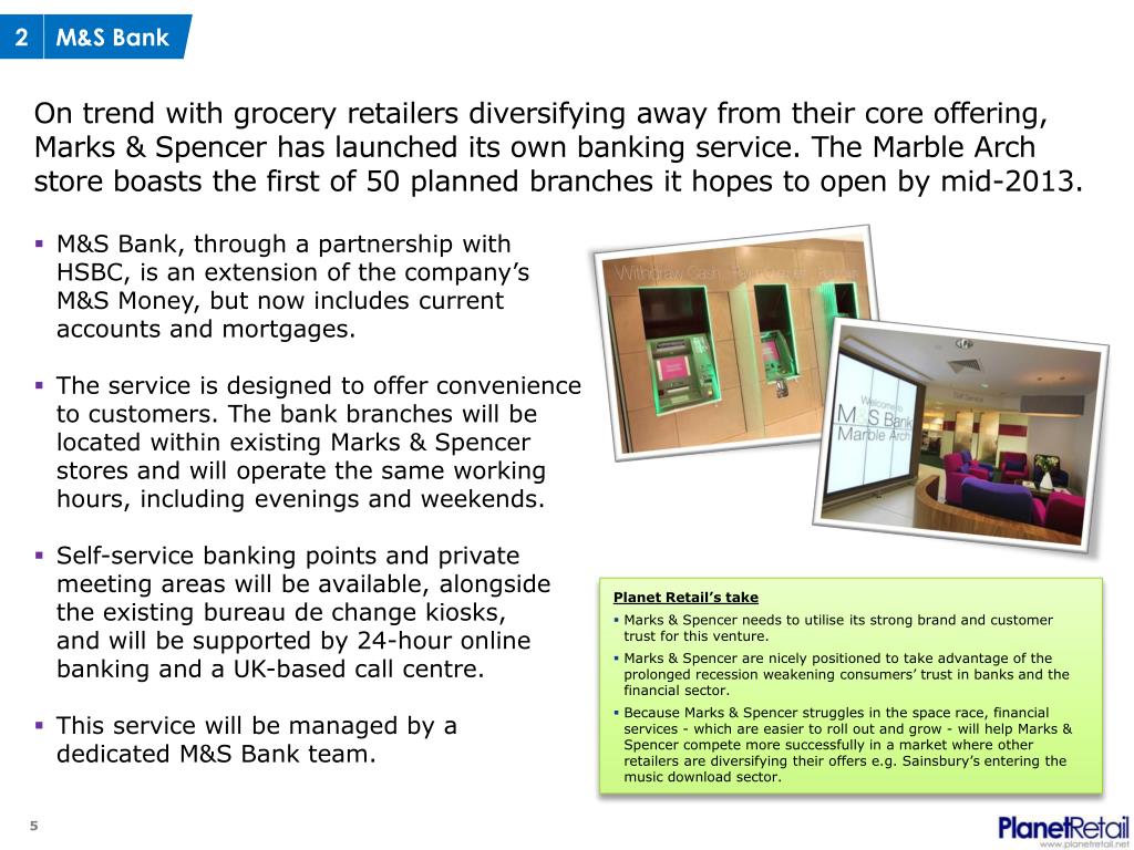 2 M&S Bank On trend with grocery retailers diversifying away from their core offering, Marks & Spencer has launched its own banking service. The Marble Arch store boasts the first of 50 planned branches it hopes to open by mid-2013. • M&S Bank, through a partnership with HSBC, is an extension of the company’s M&S Money, but now includes current accounts and mortgages. • The service is designed to offer convenience to customers. The bank branches will be located within existing Marks & Spencer stores and will operate the same working hours, including evenings and weekends. • Self-service banking points and private meeting areas will be available, alongside the existing bureau de change kiosks, and will be supported by 24-hour online banking and a UK-based call centre. • This service will be managed by a dedicated M&S Bank team. • Planet Retail’s take • Marks & Spencer needs to utilise its strong brand and customer trust for this venture. • Marks & Spencer are nicely positioned to take advantage of the prolonged recession weakening consumers’ trust in banks and the financial sector. • Because Marks & Spencer struggles in the space race, financial services - which are easier to roll out and grow - will help Marks & Spencer compete more successfully in a market where other retailers are diversifying their offers e.g. Sainsbury’s entering the music download sector.
