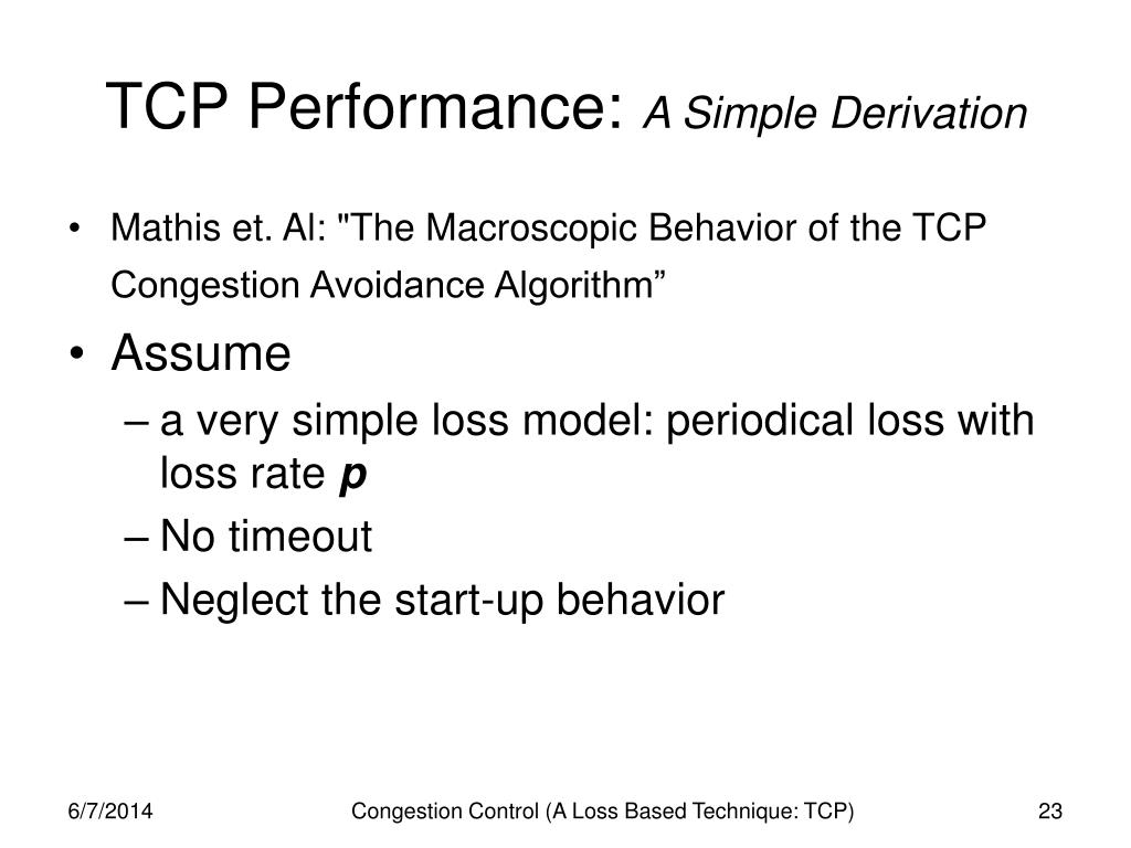 TCP Performance: A Simple Derivation • Mathis et. Al: "The Macroscopic Behavior of the TCP Congestion Avoidance Algorithm” • Assume • a very simple loss model: periodical loss with loss rate p • No timeout • Neglect the start-up behavior Congestion Control (A Loss Based Technique: TCP)