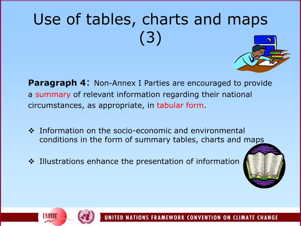 Use of tables, charts and maps (3) Paragraph 4: Non-Annex I Parties are encouraged to provide a summary of relevant information regarding their national circumstances, as appropriate, in tabular form. • Information on the socio-economic and environmental conditions in the form of summary tables, charts and maps • Illustrations enhance the presentation of information