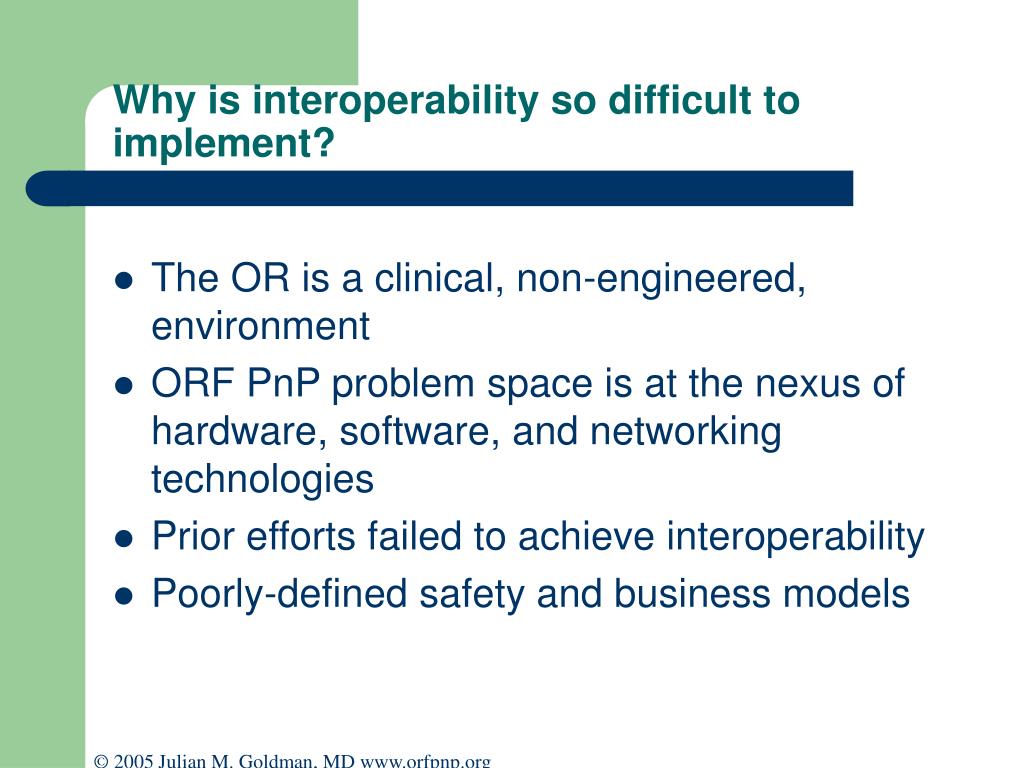 Why is interoperability so difficult to implement? • The OR is a clinical, non-engineered, environment • ORF PnP problem space is at the nexus of hardware, software, and networking technologies • Prior efforts failed to achieve interoperability • Poorly-defined safety and business models