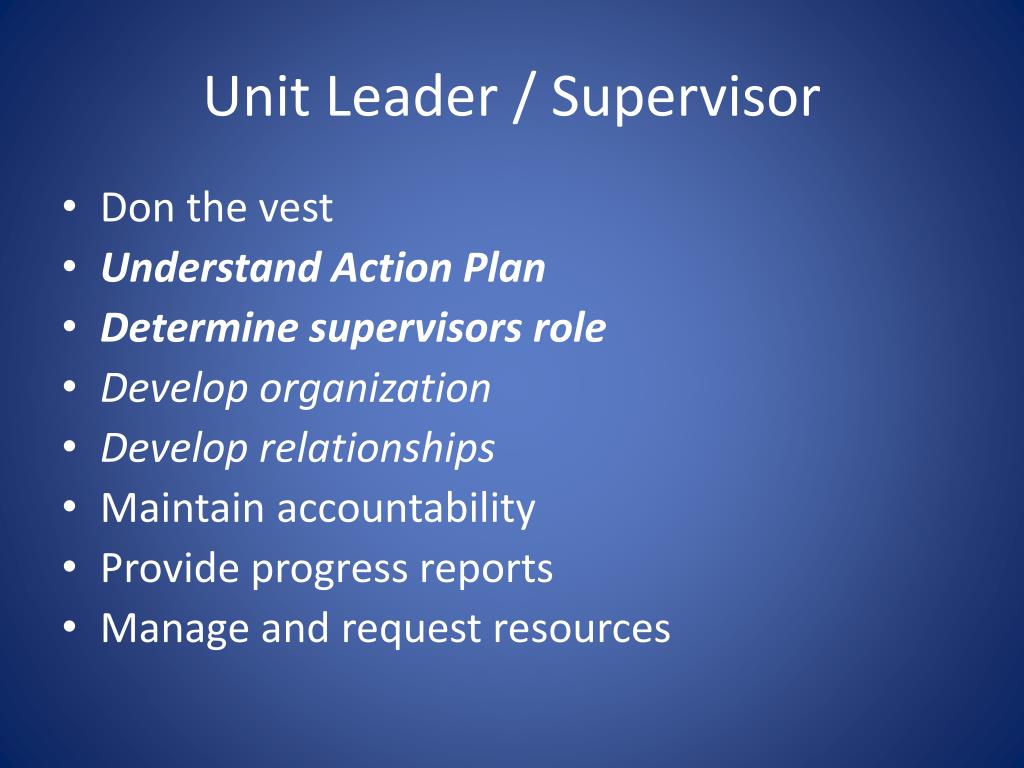 Unit Leader / Supervisor • Don the vest • Understand Action Plan • Determine supervisors role • Develop organization • Develop relationships • Maintain accountability • Provide progress reports • Manage and request resources