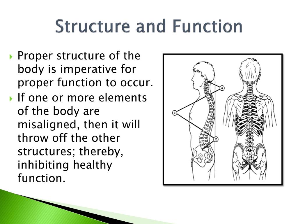 Structure and Function • Proper structure of the body is imperative for proper function to occur. • If one or more elements of the body are misaligned, then it will throw off the other structures; thereby, inhibiting healthy function.
