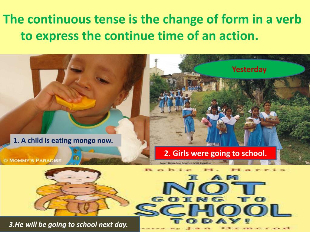 The continuous tense is the change of form in a verb to express the continue time of an action. Yesterday 1. A child is eating mongo now. 2. Girls were going to school. 3.He will be going to school next day.
