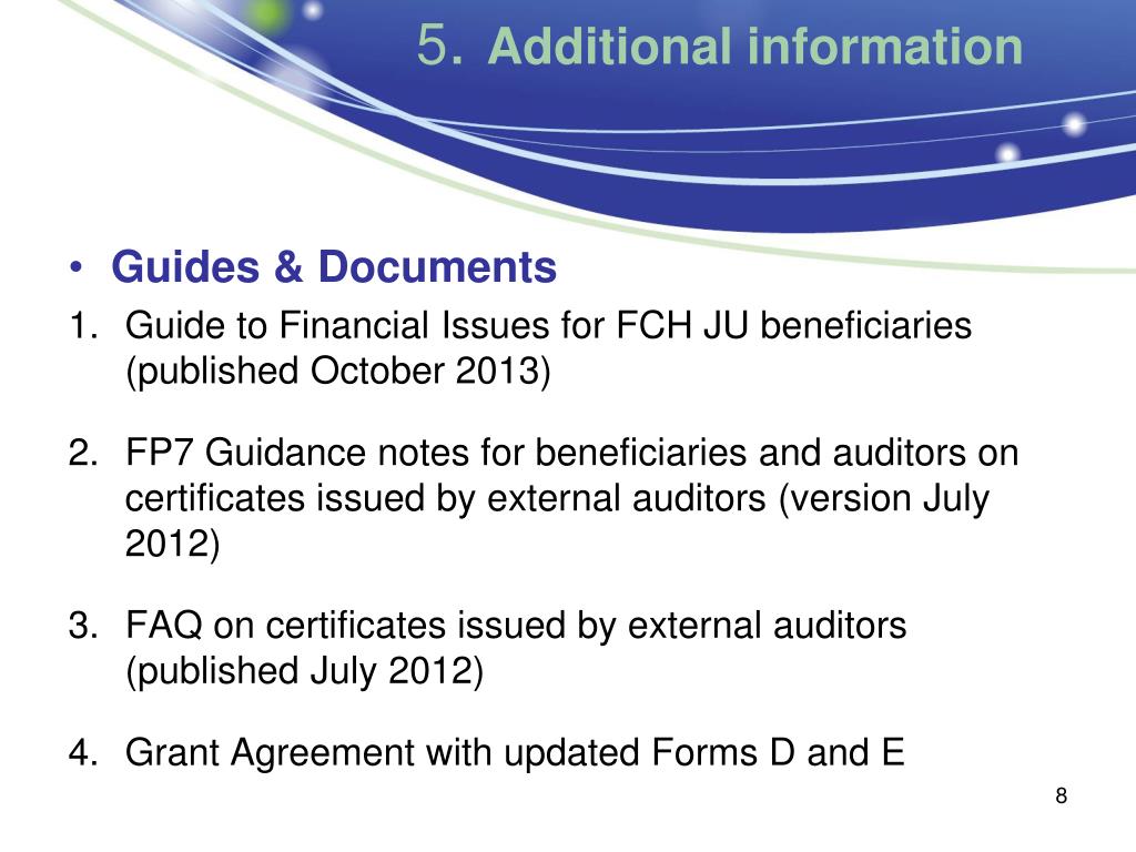 5. Additional information • Guides & Documents • Guide to Financial Issues for FCH JU beneficiaries (published October 2013) • FP7 Guidance notes for beneficiaries and auditors on certificates issued by external auditors (version July 2012) • FAQ on certificates issued by external auditors (published July 2012) • Grant Agreement with updated Forms D and E