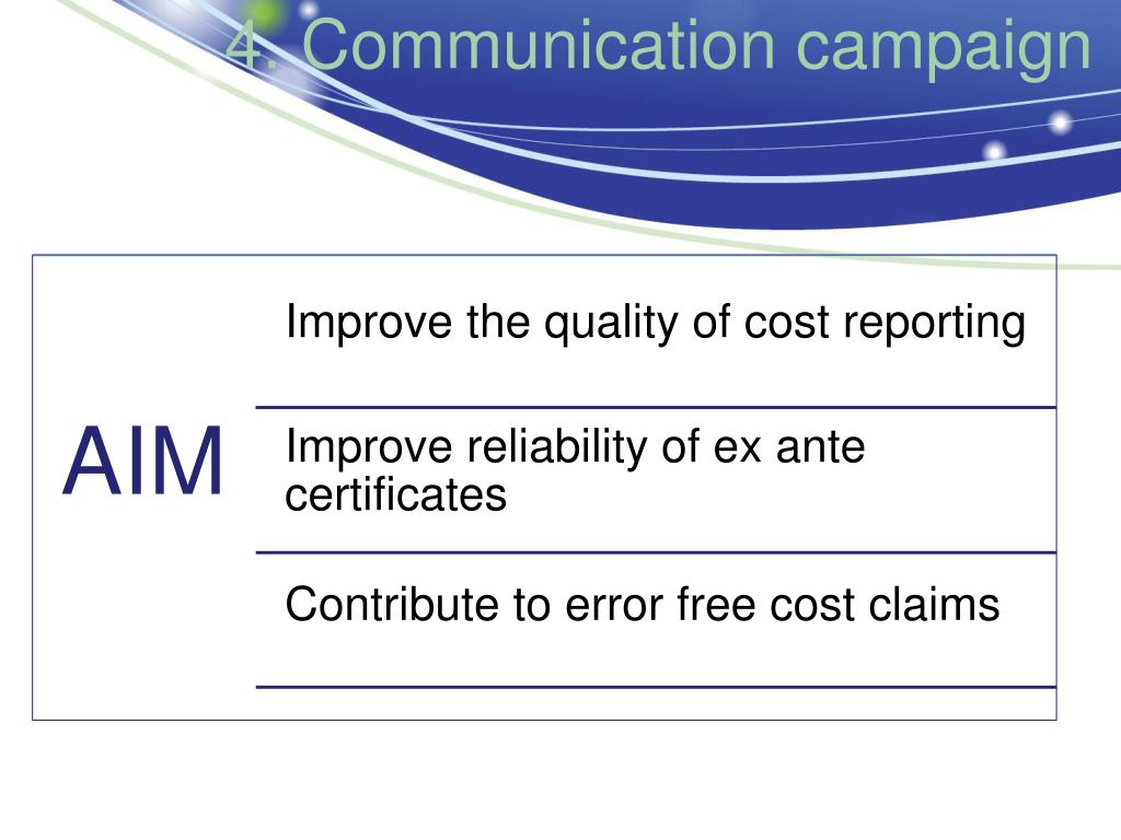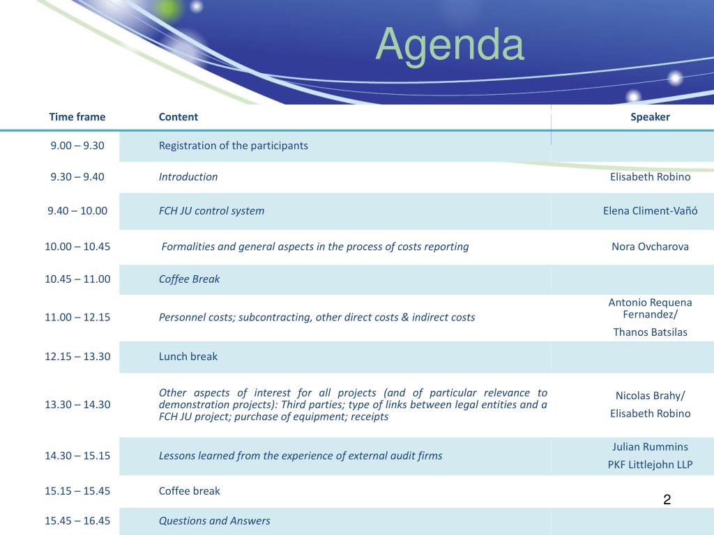 Communication Campaign. 23 June 2014 Elisabeth Robino Head of Finance & Administration. Agenda. List of contents. Introduction Cost reporting chain Consequences of errors Where to find information. 1. Introduction. FCH JU financial provisions different from FP7.