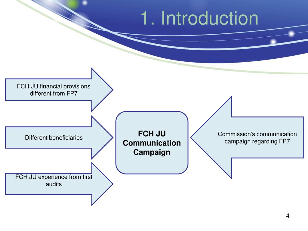 1. Introduction • FCH JU financial provisions different from FP7 Commission’s communication campaign regarding FP7 FCH JU Communication Campaign Different beneficiaries FCH JU experience from first audits