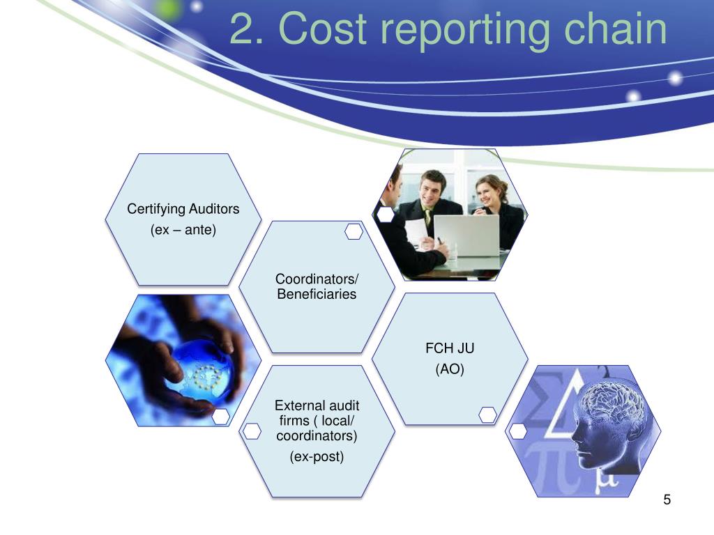 2. Cost reporting chain • Certifying Auditors • (ex – ante) • Coordinators/ Beneficiaries • FCH JU • (AO) • External audit firms ( local/ coordinators) • (ex-post)