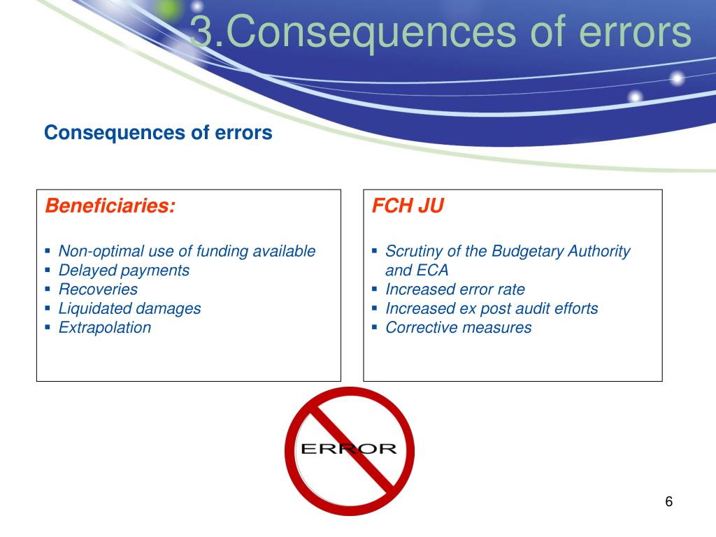 3.Consequences of errors Consequences of errors • Beneficiaries: • Non-optimal use of funding available • Delayed payments • Recoveries • Liquidated damages • Extrapolation • FCH JU • Scrutiny of the Budgetary Authority and ECA • Increased error rate • Increased ex post audit efforts • Corrective measures