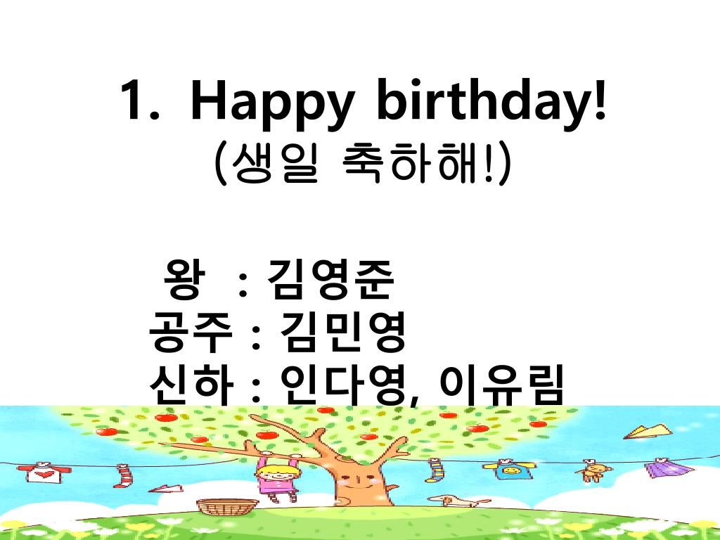 Happy birthday ! ( 생일 축하해 !) 왕 : 김영준 공주 : 김민영 신하 : 인다영 , 이유림. Happy birthday to you. Happy birthday to you. Happy birthday dear my princess. 사랑하는 나의 공주님 생일 축하합니다 . Happy birthday to you. 왕 : Happy birthday! 공주 : Oh, Thank you, dad.