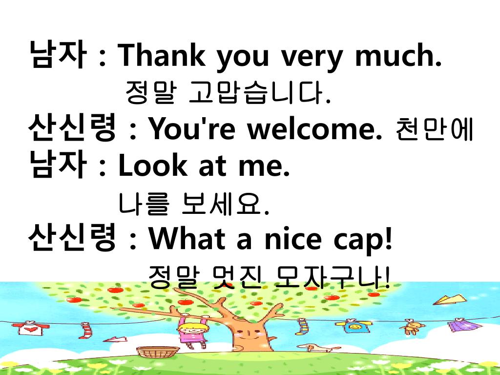 남자 : Thank you very much. • 정말 고맙습니다. • 산신령 : You're welcome. 천만에 • 남자 : Look at me. • 나를 보세요. • 산신령 : What a nice cap! • 정말 멋진 모자구나!