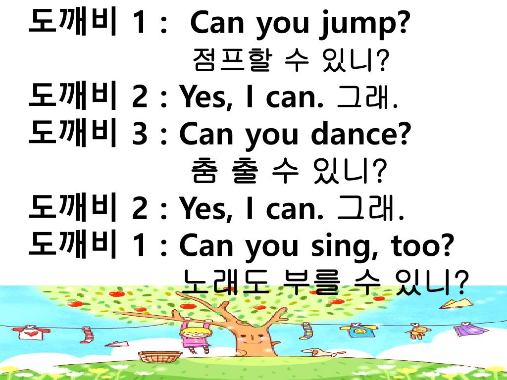 도깨비 1 : Can you jump? • 점프할 수 있니? • 도깨비 2 : Yes, I can. 그래. • 도깨비 3 : Can you dance? • 춤 출 수 있니? • 도깨비 2 : Yes, I can. 그래. • 도깨비 1 : Can you sing, too? • 노래도 부를 수 있니?