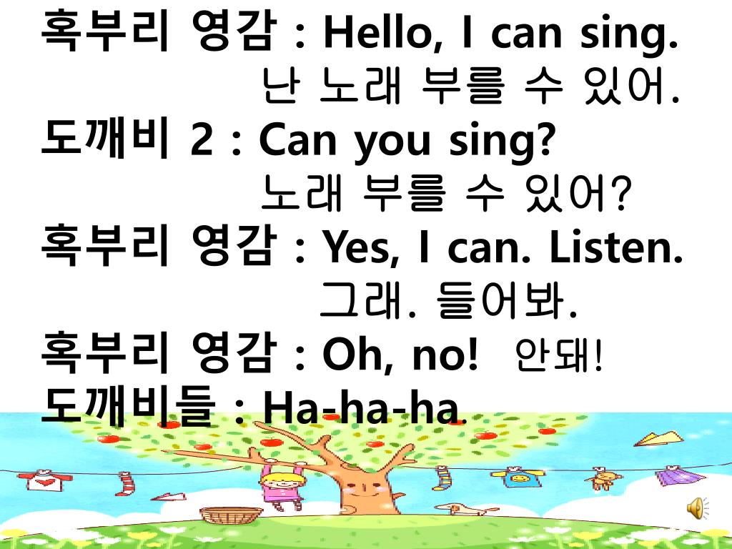 혹부리 영감 : Hello, I can sing. • 난 노래 부를 수 있어. • 도깨비 2 : Can you sing? • 노래 부를 수 있어? • 혹부리 영감 : Yes, I can. Listen. • 그래. 들어봐. • 혹부리 영감 : Oh, no! 안돼! • 도깨비들 : Ha-ha-ha.