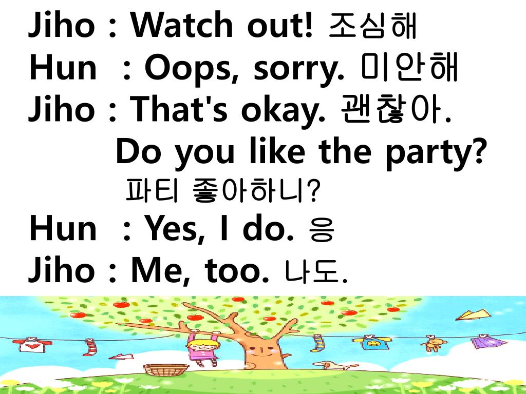Jiho : Watch out! 조심해 • Hun : Oops, sorry. 미안해 • Jiho : That's okay. 괜찮아. • Do you like the party? • 파티 좋아하니? • Hun : Yes, I do. 응 • Jiho : Me, too. 나도.