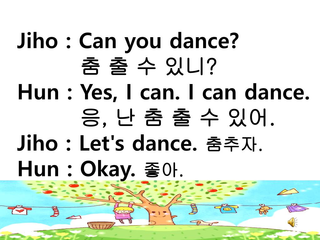 Jiho : Can you dance? • 춤 출 수 있니? • Hun: Yes, I can. I can dance. • 응, 난 춤 출 수 있어. • Jiho : Let's dance. 춤추자. • Hun : Okay. 좋아.