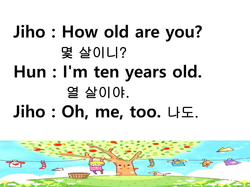 Jiho : How old are you? • 몇 살이니? • Hun : I'm ten years old. • 열 살이야. • Jiho : Oh, me, too. 나도.