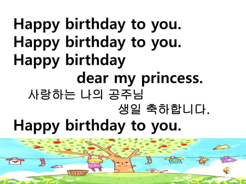 Happy birthday to you. • Happy birthday to you. • Happy birthday • dear my princess. • 사랑하는 나의 공주님 • 생일 축하합니다. • Happy birthday to you.