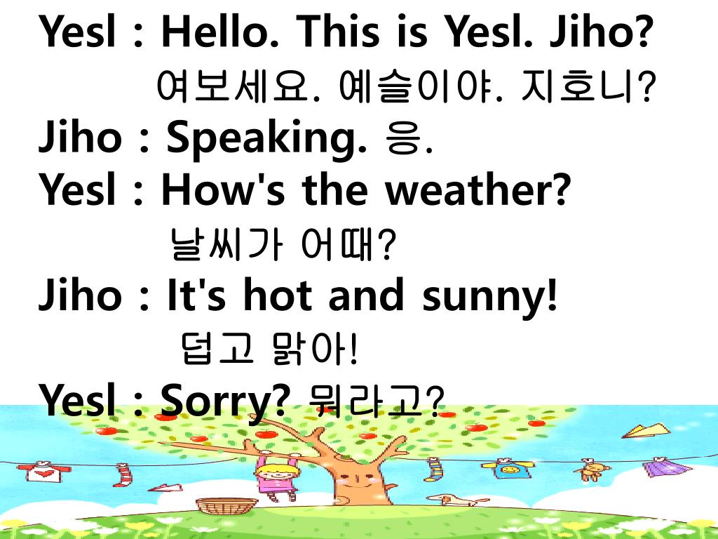 Yesl : Hello. This is Yesl. Jiho? • 여보세요. 예슬이야. 지호니? • Jiho : Speaking. 응. • Yesl : How's the weather? • 날씨가 어때? • Jiho : It's hot and sunny! • 덥고 맑아! • Yesl : Sorry? 뭐라고?