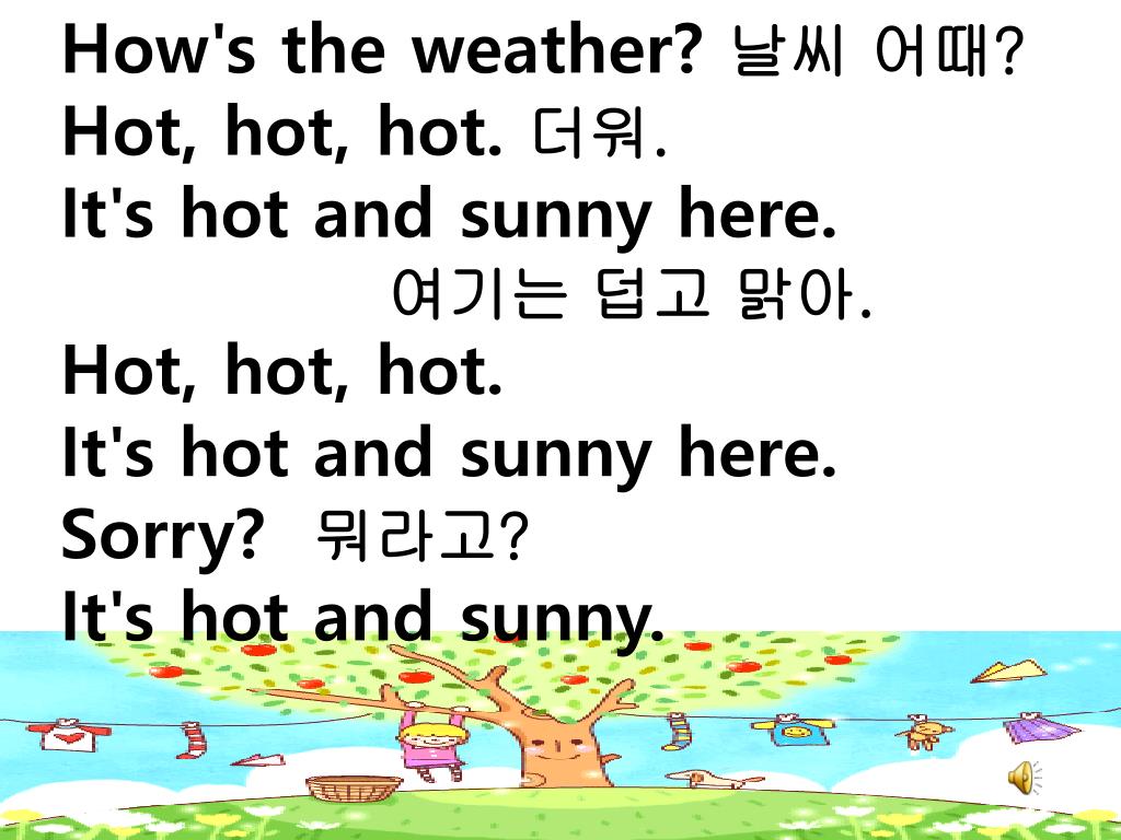 How's the weather? 날씨 어때? • Hot, hot, hot. 더워. • It's hot and sunny here. • 여기는 덥고 맑아. • Hot, hot, hot. • It's hot and sunny here. • Sorry? 뭐라고? • It's hot and sunny.