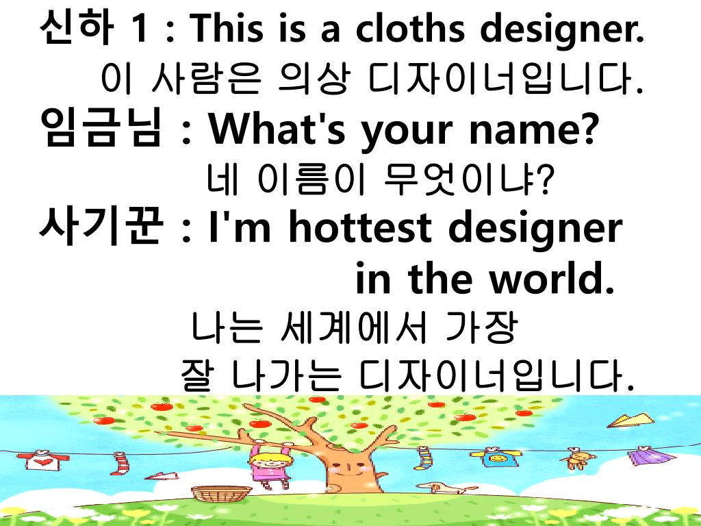 신하 1 : This is a cloths designer. • 이 사람은 의상 디자이너입니다. • 임금님 : What's your name? • 네 이름이 무엇이냐? • 사기꾼 : I'm hottest designer • in the world. • 나는 세계에서 가장 • 잘 나가는 디자이너입니다.