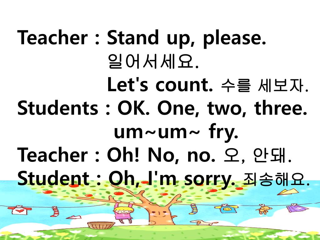 Teacher : Stand up, please. • 일어서세요. • Let's count. 수를 세보자. • Students : OK. One, two, three. • um~um~ fry. • Teacher : Oh! No, no. 오, 안돼. • Student : Oh, I'm sorry. 죄송해요.