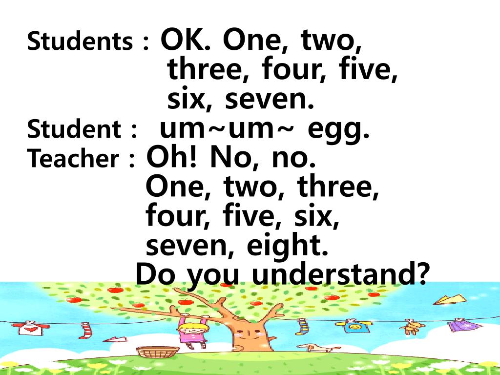 Students : OK. One, two, • three, four, five, • six, seven. • Student :um~um~ egg. • Teacher : Oh! No, no. • One, two, three, • four, five, six, • seven, eight. • Do you understand?