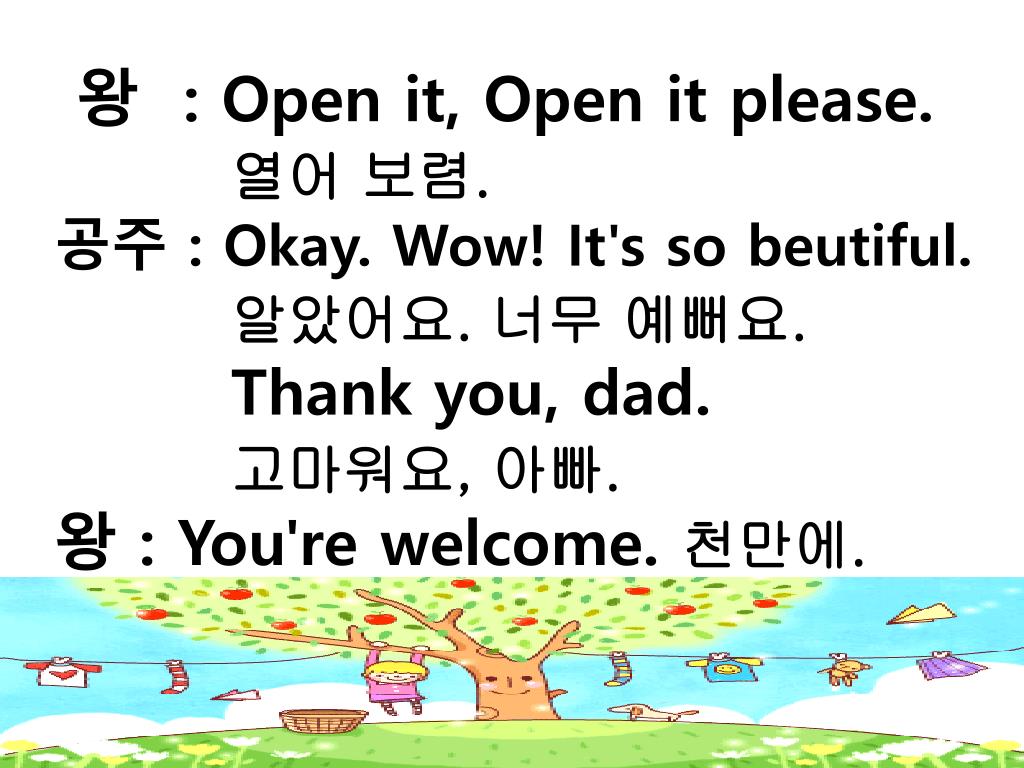 왕 : Open it, Open it please. • 열어 보렴. • 공주 : Okay. Wow! It's so beutiful. • 알았어요. 너무 예뻐요. • Thank you, dad. • 고마워요, 아빠. • 왕 : You're welcome. 천만에.