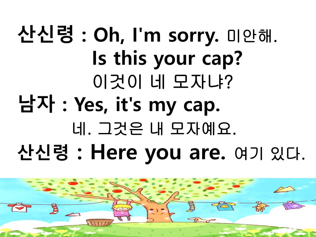 산신령 : Oh, I'm sorry. 미안해. • Is this your cap? • 이것이 네 모자냐? • 남자 : Yes, it's my cap. • 네. 그것은 내 모자예요. • 산신령: Here you are. 여기 있다.