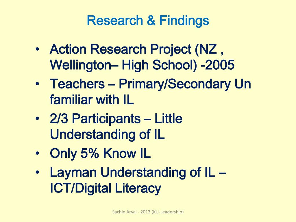 Research & Findings Action Research Project (NZ , Wellington– High School) -2005 Teachers – Primary/Secondary Un familiar with IL 2/3 Participants – Little Understanding of IL Only 5% Know IL Layman Understanding of IL – ICT/Digital Literacy Sachin Aryal - 2013 (KU-Leadership)