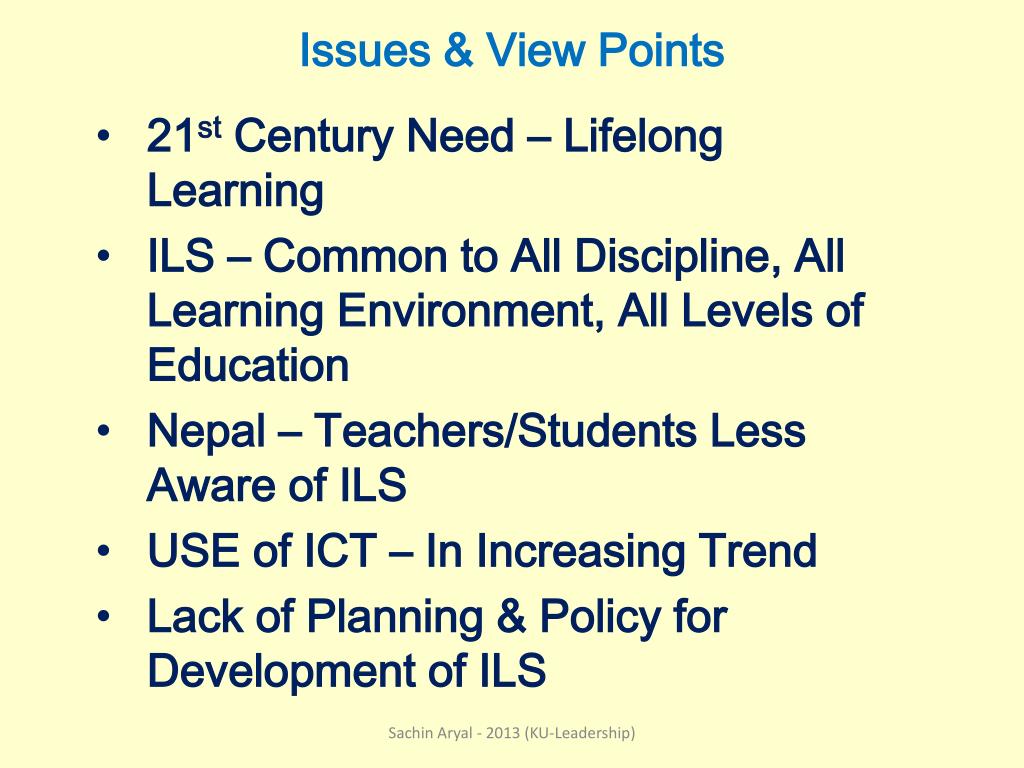 Issues & View Points 21st Century Need – Lifelong Learning ILS – Common to All Discipline, All Learning Environment, All Levels of Education Nepal – Teachers/Students Less Aware of ILS USE of ICT – In Increasing Trend Lack of Planning & Policy for Development of ILS Sachin Aryal - 2013 (KU-Leadership)