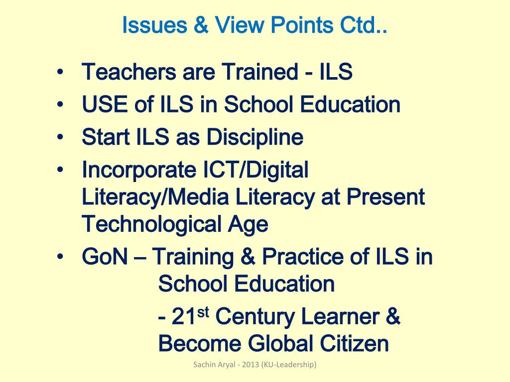 Issues & View Points Ctd.. Teachers are Trained - ILS USE of ILS in School Education Start ILS as Discipline Incorporate ICT/Digital Literacy/Media Literacy at Present Technological Age GoN – Training & Practice of ILS in School Education - 21st Century Learner & Become Global Citizen Sachin Aryal - 2013 (KU-Leadership)