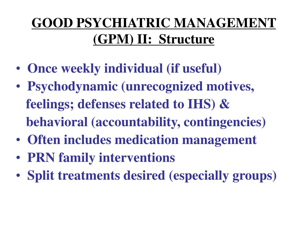 GOOD PSYCHIATRIC MANAGEMENT (GPM) II: Structure • Once weekly individual (if useful) • Psychodynamic (unrecognized motives, • feelings; defenses related to IHS) & • behavioral (accountability, contingencies) • Often includes medication management • PRN family interventions • Split treatments desired (especially groups)