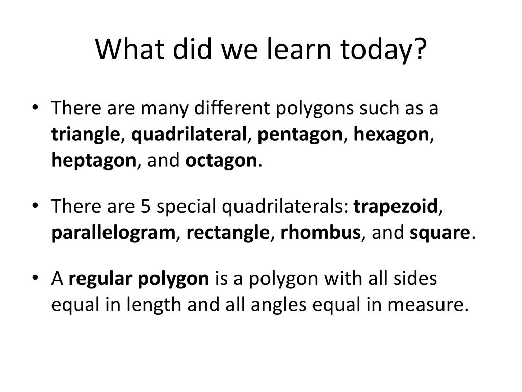 What did we learn today? • There are many different polygons such as a triangle, quadrilateral, pentagon, hexagon, heptagon, and octagon. • There are 5 special quadrilaterals: trapezoid, parallelogram, rectangle, rhombus, and square. • A regular polygon is a polygon with all sides equal in length and all angles equal in measure.