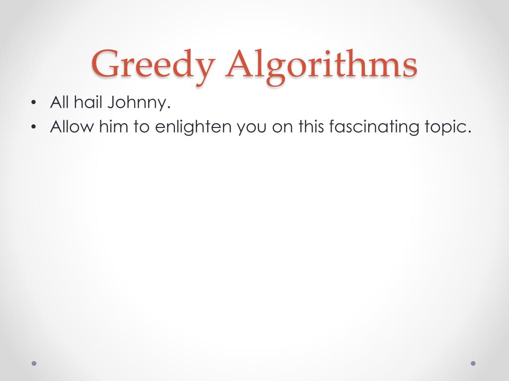 Greedy Algorithms • All hail Johnny. • Allow him to enlighten you on this fascinating topic.