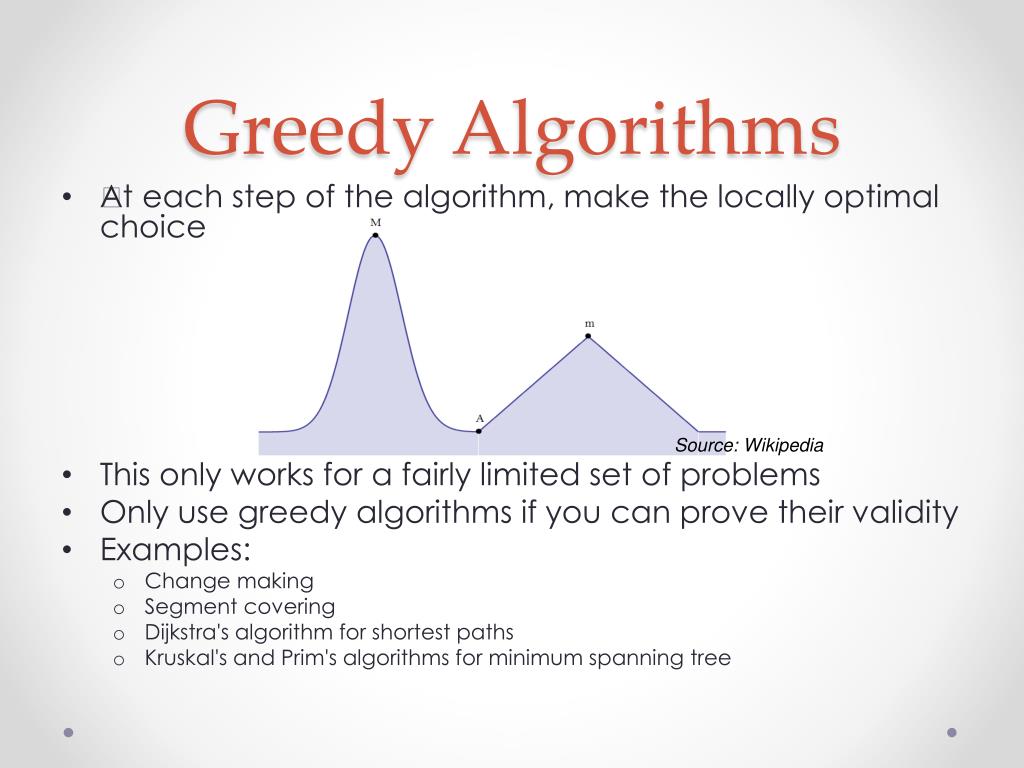 Greedy Algorithms • At each step of the algorithm, make the locally optimal choice • This only works for a fairly limited set of problems • Only use greedy algorithms if you can prove their validity • Examples: • Change making • Segment covering • Dijkstra's algorithm for shortest paths • Kruskal's and Prim's algorithms for minimum spanning tree Source: Wikipedia