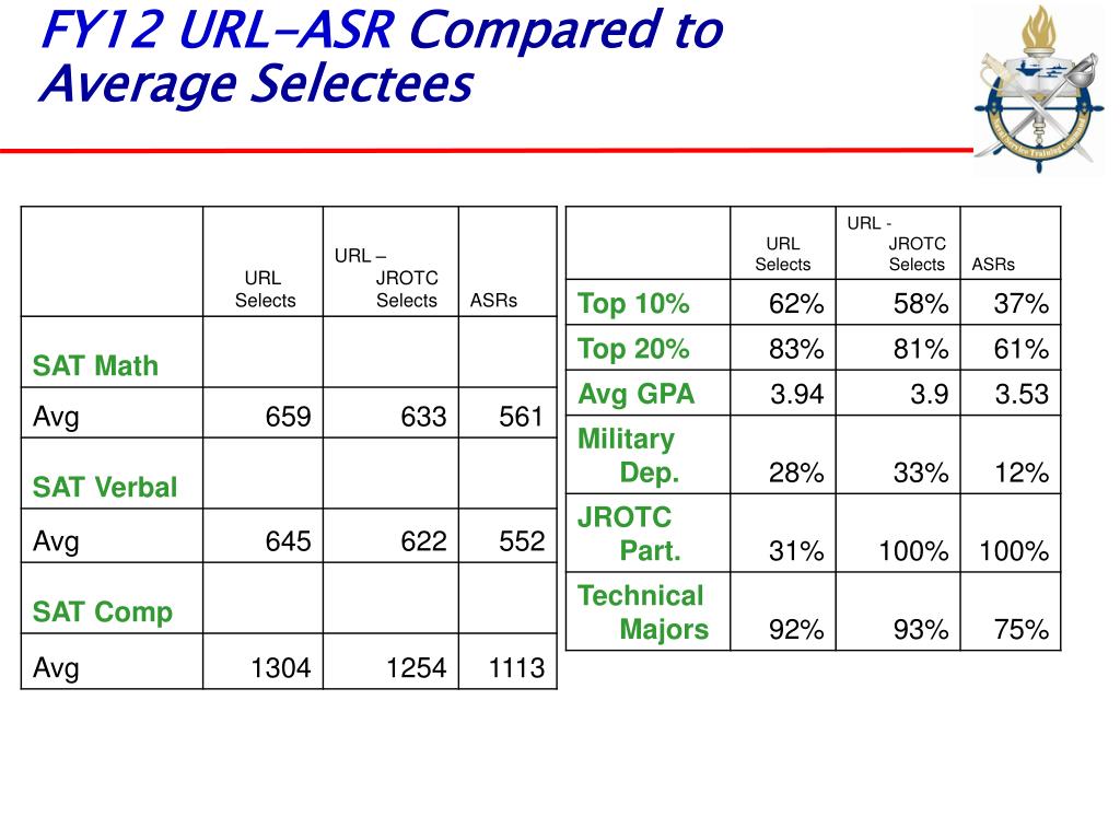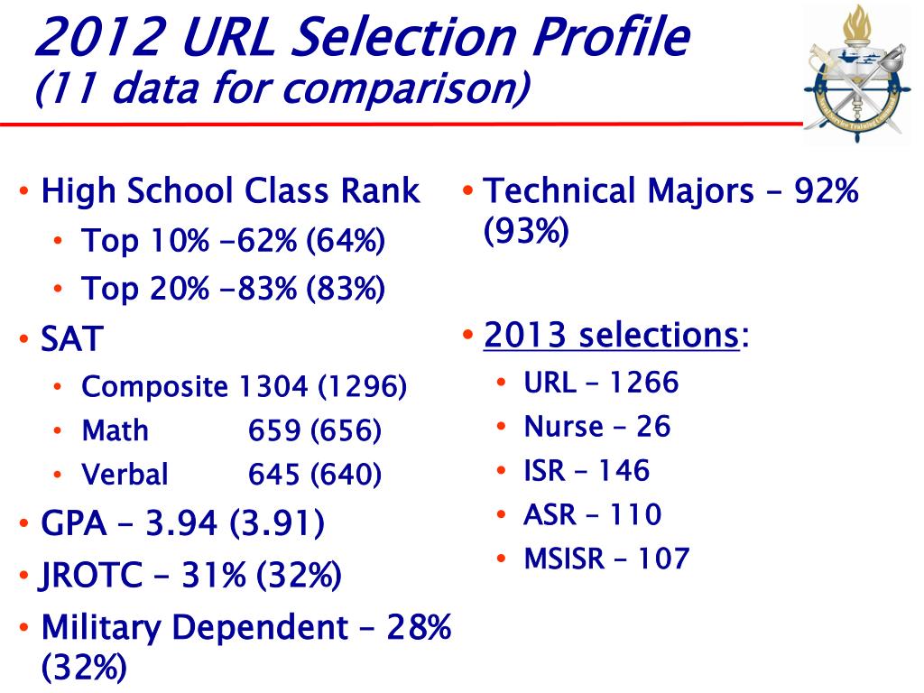 High School Class Rank Top 10% -62% (64%) Top 20% -83% (83%) SAT Composite 1304 (1296) Math 659 (656) Verbal 645 (640) GPA – 3.94 (3.91) JROTC – 31% (32%) Military Dependent – 28% (32%) Technical Majors – 92% (93%) 2013 selections: URL – 1266 Nurse – 26 ISR – 146 ASR – 110 MSISR – 107 2012 URL Selection Profile (11 data for comparison)
