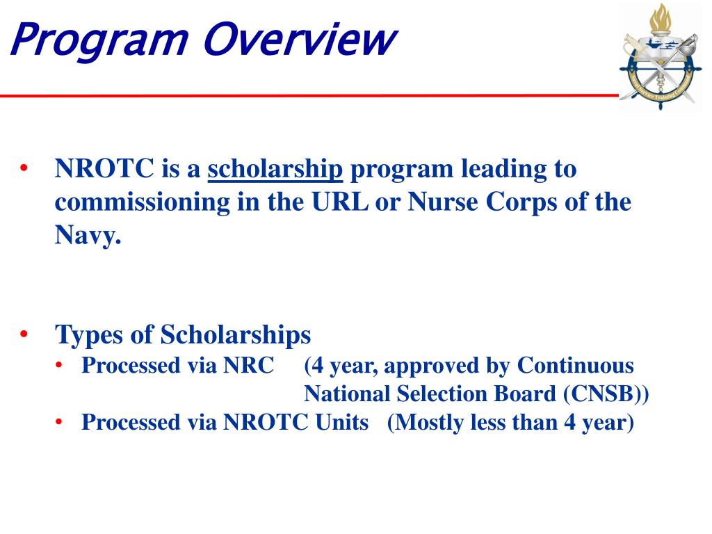 NROTC Scholarships. NROTC Scholarship Programs Brief Summer 2013. Program Overview. NROTC is a scholarship program leading to commissioning in the URL or Nurse Corps of the Navy. Types of Scholarships Processed via NRC (4 year, approved by Continuous National Selection Board (CNSB))