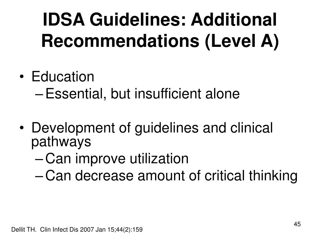 IDSA Guidelines: Additional Recommendations (Level A) Education Essential, but insufficient alone Development of guidelines and clinical pathways Can improve utilization Can decrease amount of critical thinking 45 Dellit TH. Clin Infect Dis 2007 Jan 15;44(2):159
