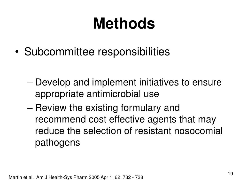 Methods Subcommittee responsibilities Develop and implement initiatives to ensure appropriate antimicrobial use Review the existing formulary and recommend cost effective agents that may reduce the selection of resistant nosocomial pathogens 19 Martin et al. Am J Health-Sys Pharm 2005 Apr 1; 62: 732 - 738