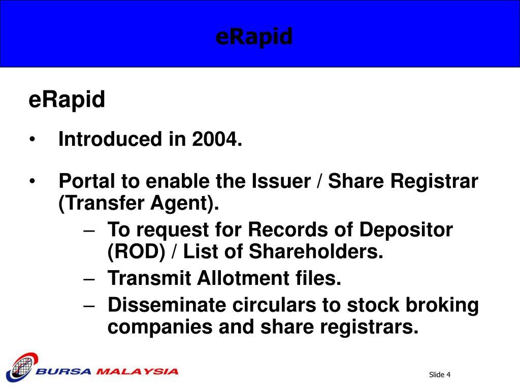 eRapid eRapid • Introduced in 2004. • Portal to enable the Issuer / Share Registrar (Transfer Agent). • To request for Records of Depositor (ROD) / List of Shareholders. • Transmit Allotment files. • Disseminate circulars to stock broking companies and share registrars.