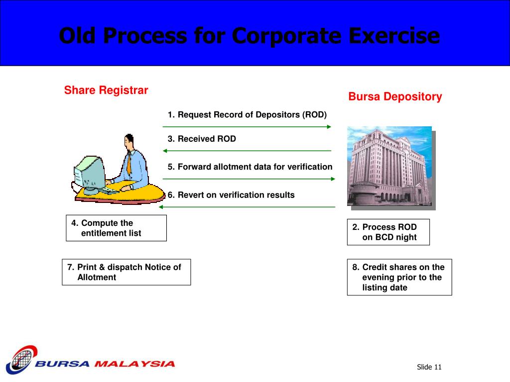 Old Process for Corporate Exercise Share Registrar Bursa Depository • Request Record of Depositors (ROD) • Received ROD • Forward allotment data for verification • Revert on verification results • Compute the entitlement list • Process ROD on BCD night • Print & dispatch Notice of Allotment • Credit shares on the evening prior to the listing date