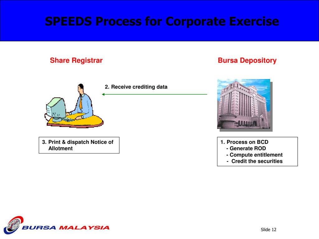 SPEEDS Process for Corporate Exercise Share Registrar Bursa Depository • Receive crediting data • Print & dispatch Notice of Allotment • Process on BCD • - Generate ROD • - Compute entitlement - Credit the securities