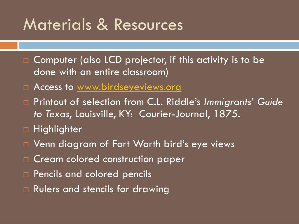 Materials & Resources • Computer (also LCD projector, if this activity is to be done with an entire classroom) • Access to www.birdseyeviews.org • Printout of selection from C.L. Riddle’s Immigrants’ Guide to Texas, Louisville, KY: Courier-Journal, 1875. • Highlighter • Venn diagram of Fort Worth bird’s eye views • Cream colored construction paper • Pencils and colored pencils • Rulers and stencils for drawing