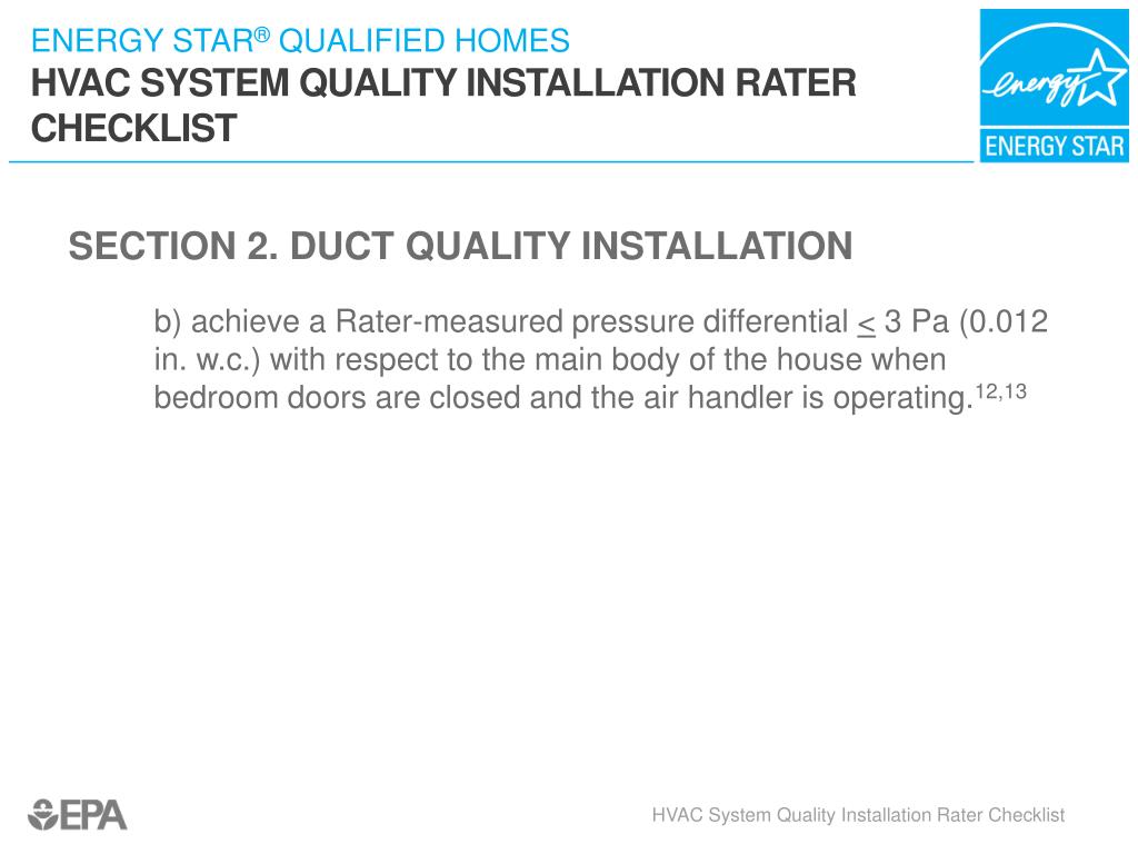 SECTION 2. DUCT QUALITY INSTALLATION b) achieve a Rater-measured pressure differential < 3 Pa (0.012 in. w.c.) with respect to the main body of the house when bedroom doors are closed and the air handler is operating.12,13 HVAC System Quality Installation Rater Checklist