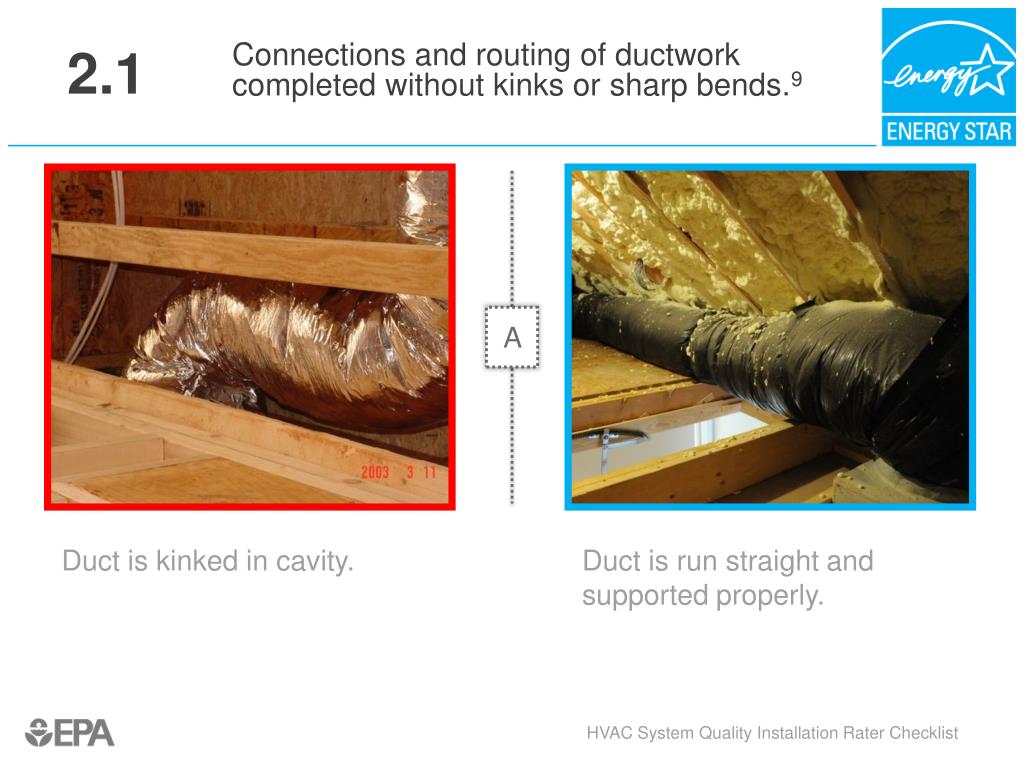2.1 Connections and routing of ductwork completed without kinks or sharp bends.9 A Duct is kinked in cavity. HVAC System Quality Installation Rater Checklist Duct is run straight and supported properly.