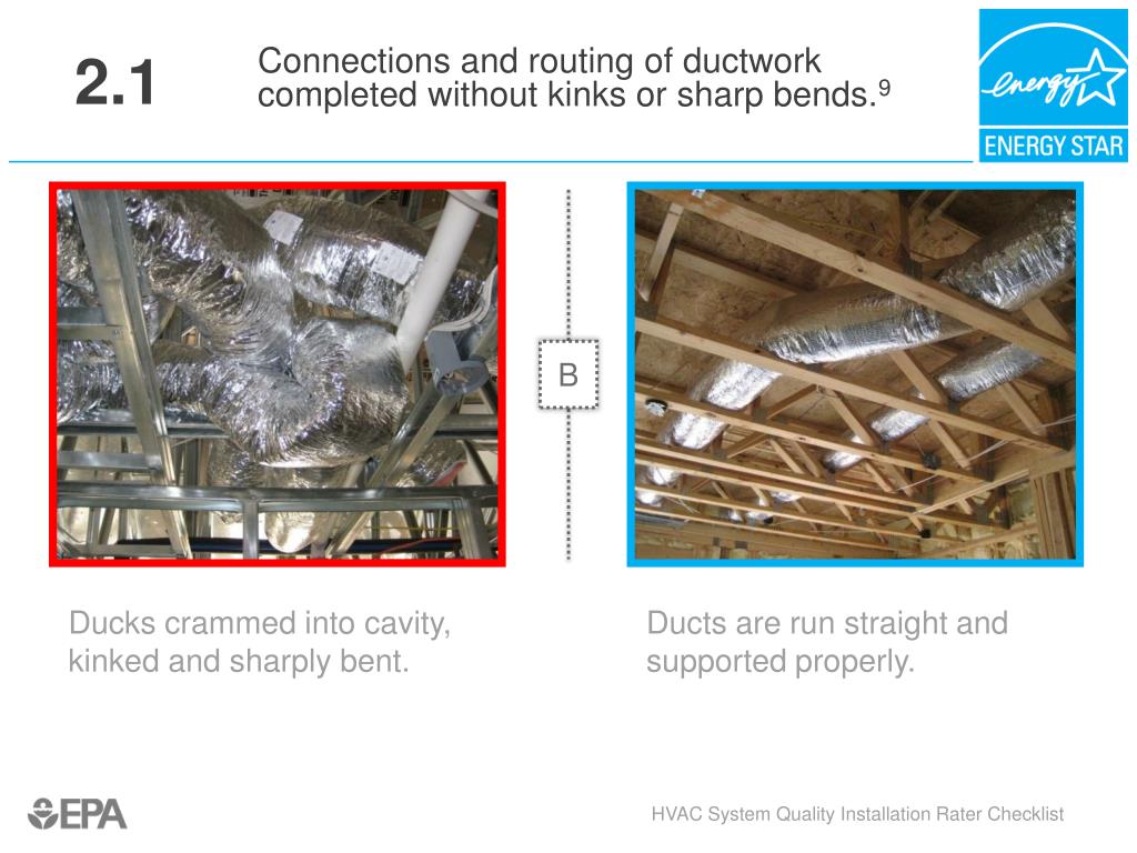 2.1 Connections and routing of ductwork completed without kinks or sharp bends.9 B Ducks crammed into cavity, kinked and sharply bent. HVAC System Quality Installation Rater Checklist Ducts are run straight and supported properly.