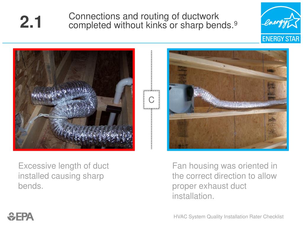 2.1 Connections and routing of ductwork completed without kinks or sharp bends.9 C Excessive length of duct installed causing sharp bends. HVAC System Quality Installation Rater Checklist Fan housing was oriented in the correct direction to allow proper exhaust duct installation.