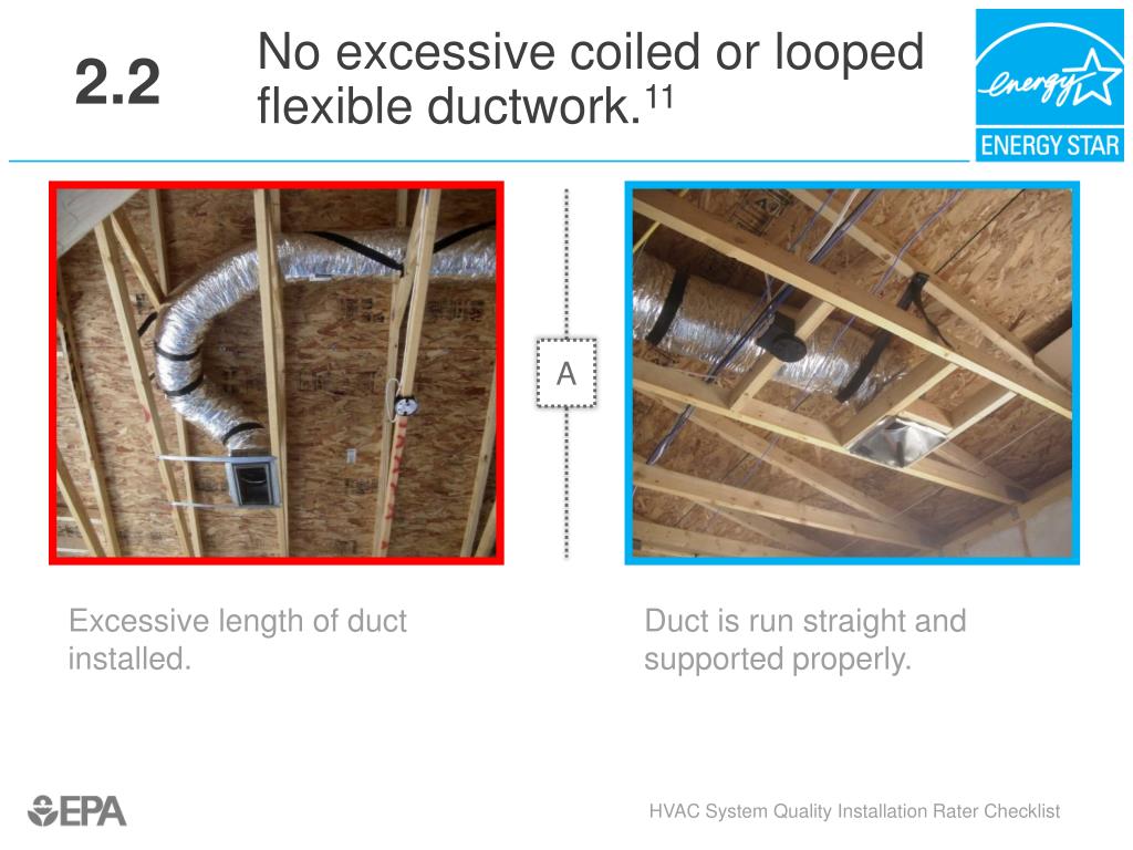2.2 No excessive coiled or looped flexible ductwork.11 A Excessive length of duct installed. HVAC System Quality Installation Rater Checklist Duct is run straight and supported properly.